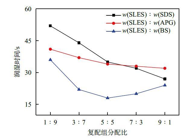 實驗測得SLES,SDS,APG和BS在w=0.2%時的潤濕時間依次為26,102,39和42 s。由圖5可知,SLES與SDS、APG復配時,潤濕性能未表現出明顯的增效作用,潤濕時間的降低可歸因于SLES的潤濕能力更好,因此隨著SLES組分的增加,復配溶液的潤濕時間降低。SLES與BS復配時,潤濕能力表現出明顯的增效作用,當質量分數比為5:5時,潤濕時間為18 s,低于兩種單一物質的潤濕時間。