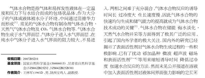 【摘要】:表面活性劑能夠減小液體的表面張力以及兩相液體間的界面張力,界面張力的減小有利于促進氣體水合物快速形成和提高水合物儲氣能力.為定量研究兩相液體間界面張力對氣體水合物形成的影響,用界面張力儀實測不同溫度時蒸餾水、HCFC-141b的表面張力以及HCFC-141b/蒸餾水、HCFC-141b/十二烷基硫酸鈉溶液(0.247%)、HCFC-141b/十二烷基磺酸鈉溶液(0.245%)、HCFC-141b/十二烷基苯磺酸鈉溶液(0.057 6%)的界面張力,測試結果表明,表面活性劑對降低兩相液體間界面張力的作用十分明顯,其中十二烷基苯磺酸鈉溶液對降低界面張力最為突出,降到HCFC-141b/蒸餾水界面張力值的9%左右,為定量研究氣體水合物等優選表面活性劑提供了科學的依據。