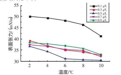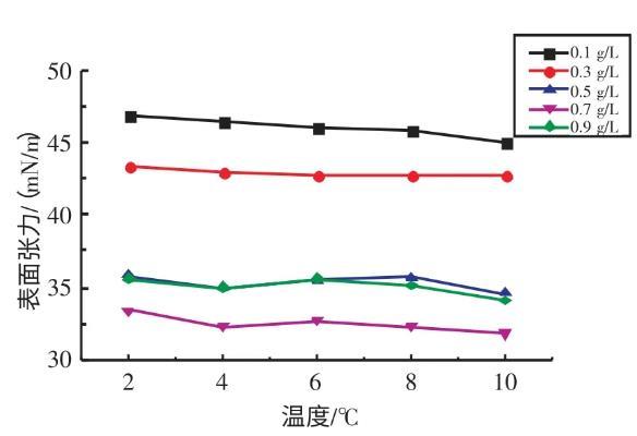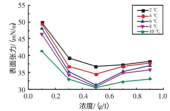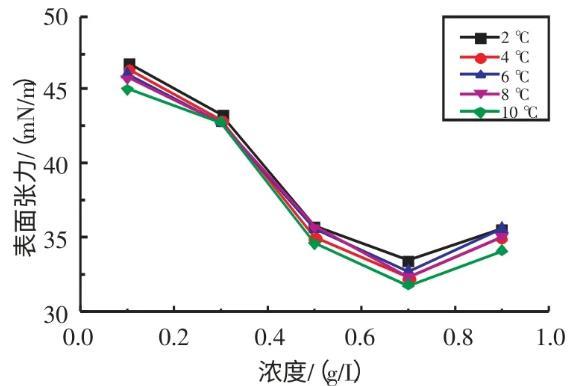 2.2.1不同溫度下十二烷基苯磺酸鈉溶液表面張力與濃度的關系實驗研究了在溫度為2、4、6、8、10℃條件下,SDBS溶液的表面張力與濃度的關系(見圖3)。由圖3可知,當濃度在0.1~0.7 g/L時,隨著SDBS溶液濃度的升高,其表面張力逐漸減?。划敐舛仍?.7~0.9 g/L時,隨著SDBS溶液濃度的升高,其表面張力逐漸增大。當SDBS溶液濃度為0.7 g/L時,其表面張力取得最小值。