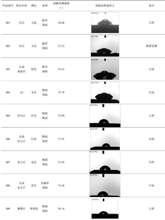 本文運用現代儀器(FTA200動態(tài)接觸角測量儀)測量了15個天然和合成寶玉石品種(鉆石、合成碳硅石、合成立方氧化鋯、碧璽、托帕石、翡翠、琥珀等),以及經覆膜和充填2種處理方法的寶玉石樣品(鍍膜鉆石、覆膜托帕石、覆膜翡翠、覆膜琥珀、充填碧璽)的表面接觸角,并運用公式計算其表面張力。