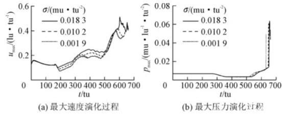 圖2不同表面張力條件下空化泡潰滅過程中最大速度和最大壓力演化過程