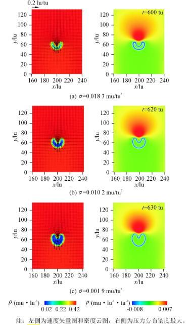 本節選取空化泡內外初始壓差Δp=0.003 8、0.006 8、0.010 2 mu/(lu·tu2)三種壓力,無量綱距離λ=1.6條件下,不同表面張力系數對空化泡潰滅過程中潰滅形態、流場、最大微射流速度和最大潰滅壓力的影響。