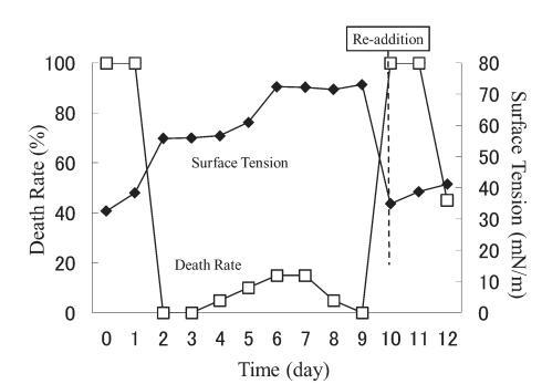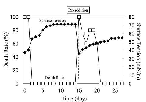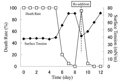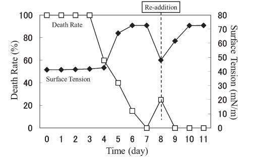 結果,在第8天重新加入LAS使試液的表面張力降低到與初始階段相同的水平,但死亡率沒有達到100%。 重新添加后不久,觀察到表面張力值迅速增加,水生毒性和死亡率迅速下降。 重新添加 LAS 后,死亡率暫時增加,但隨后立即降至 0%。 重新添加后第 2 天,表面張力值達到約 72.8 mN/m。