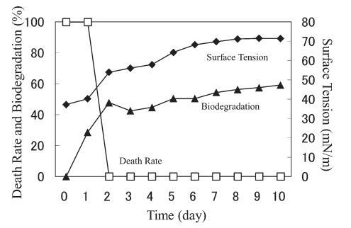 AE 的生物降解速度比 LAS 快。 對于 10 mg/L AE9,BOD 和表面張力值在測試開始后立即開始增加,死亡率立即下降(圖 3)。 表面張力值在第 2 天達到約 72.8 mN/m。 該結果與之前的報告一致9),其中比較了基于 CO2 量的生物降解率(測量的 CO2 產量/理論 CO2 產量)和 CTAS 的降低率。 也就是說,Strum 研究中 CTAS 的降低對應于我們研究中表面張力值的增加。