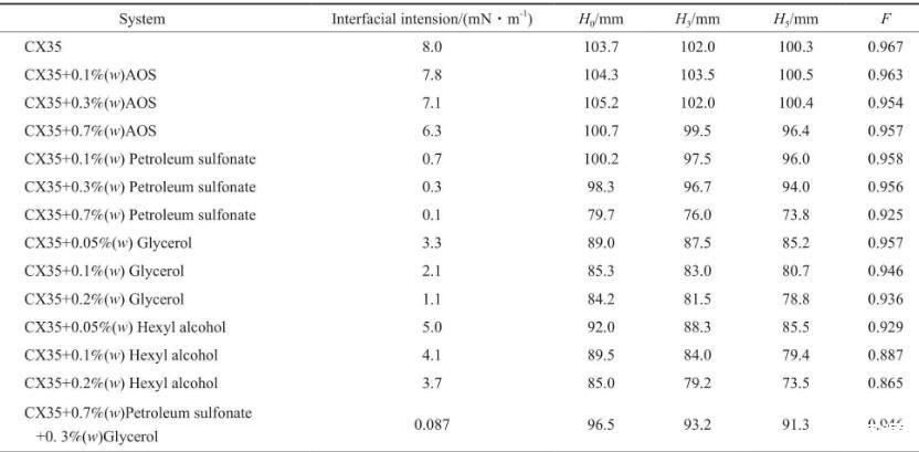 CX35雖具有降低油水界面張力的能力,但加入CX35后,油水界面張力仍大于10-1mN/m數(shù)量級。離子型表面活性劑與醇混合可降低油水界面張力,但醇會影響驅油劑的起泡性能。不同復配體系的油水界面張力見表1。由表1可看出,石油磺酸鹽降低界面張力的效果尤為突出。這是因為,石油磺酸鹽含苯環(huán)及類苯結構,且苯環(huán)上有疏水碳鏈,與原油中的瀝青質和芳烴等物質結構相似,故石油磺酸鹽易吸附在油水界面上從而降低油水界面張力。同時,石油磺酸鹽還可提高驅油劑在空隙中的洗油效率,也可通過乳液產(chǎn)生的阻力提高驅油劑的波及效率。在m(CX35)∶m(石油磺酸鹽)∶m(甘油)=1∶0.7∶0.3的條件下得到的ZX35的起泡高度可達到95 mm以上,穩(wěn)泡能力達到0.946。