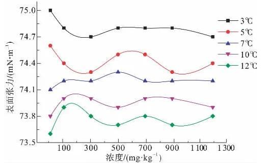圖3為3、5、7、10、12℃下,非離子型表面活性劑P123溶液的表面張力隨濃度變化示意圖。由圖3可知,P123在低濃度下就能夠顯著降低溶液表面張力,在400 mg/kg時表面張力達到最低值,之后隨濃度增大,表面張力變化不大,因此CTAB的臨界膠束濃度CMC即在此濃度范圍附近。在所測溫度范圍內,當P123溶液達到CMC以后,表面張力值在40.5~45.5 mN/m之間。隨溫度變化,表面張力值相差較大。