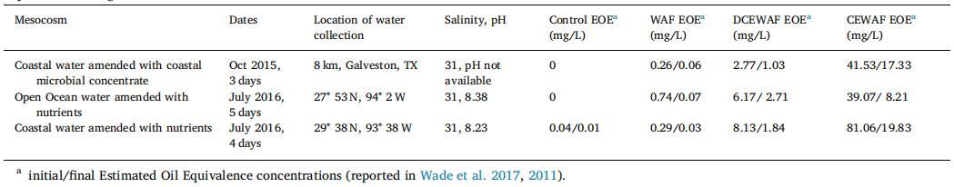 海水是從墨西哥灣收集的,用于填充 12 罐,每個 130 L,其中 4 個處理一式三份: 對照(海水)、WAF(用 Macondo 替代油,一種輕質低硫原油,化學性質類似于 在深水期間從 Macondo 井中溢出的石油 Horizon 事件)、CEWAF(Corexit + oil 比例為 1:20)和 DCEWAF (CEWAF 稀釋十倍)。 仔細描述了中間宇宙的設置 在韋德等人。 (2017) 以及準備 WAF 的程序, CEWAF 和 DCEWAF。 簡而言之,注入油或油 + Corexit 進入帶擋板的再循環罐并混合約 24 小時,然后將下層 分數(即,避免表面光滑)被添加到各自的 坦克。 有關中宇宙實驗的信息在表 1 中給出 根據估計值添加初始和最終油濃度 根據 Wade 等人確定的油當量 (EOE)。 (2011 年,2017 年)。 實驗持續 3 到 5 天,運行 12:12 明暗循環。 在表 1 中,對于使用沿海 用微生物濃縮物修正的水域,浮游生物(≥63 μm)是 用網收集并轉移到聚碳酸酯瓶中。 這個 將濃縮的浮游生物塊引入罐中并攪拌(2 L 到每個)在開始實驗之前。 對于公海水域和沿海水域的中宇宙,營養物質進行了修正, 添加營養物(最終濃度 f/20)并攪拌罐。