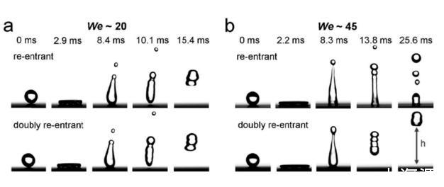 由于較低的表面張力,油滴很容易在固體表面鋪展?jié)櫇瘢瑥亩档驼麄€體系的界面自由能,因此,實現(xiàn)低表面扎張力的超排斥相對來說比較困難。為了實現(xiàn)低表面張力油的超排斥,目前有相關研究人員提出了雙內(nèi)凹結構,通過雙內(nèi)凹結構能夠有效鎖定固-液-氣三相接觸線,阻止液體沿著表面微結構向下滑移,從而將液體支撐在微結構空氣層上面而實現(xiàn)對不同液體的有效排斥。